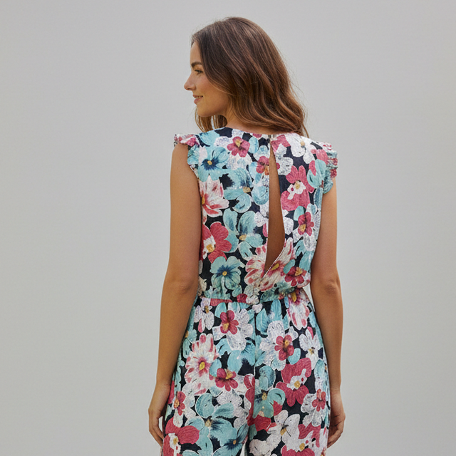 Cette combinaison pour femme se distingue par son imprimé floral éclatant aux nuances de rose, bleu et corail sur fond sombre. Sa coupe flatteuse présente un décolleté en V élégant et des emmanchures délicatement volantées qui structurent la silhouette avec douceur. Le détail irrésistible ? Un dos fendu subtil qui apporte une touche de sensualité moderne à votre tenue.