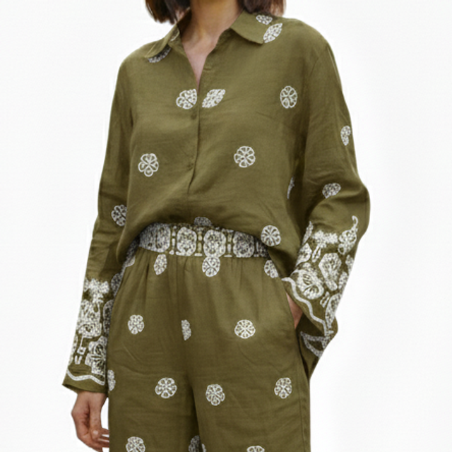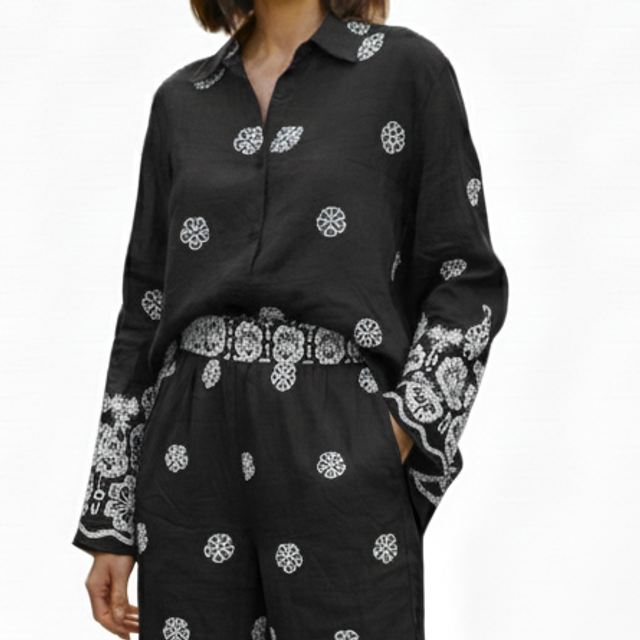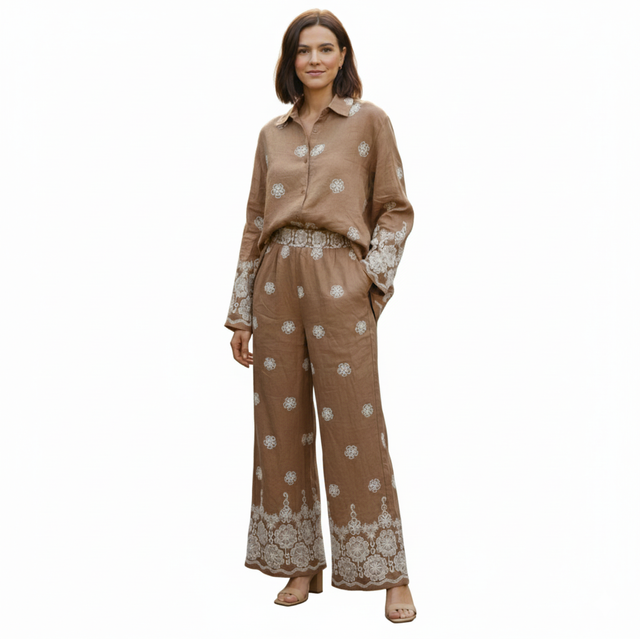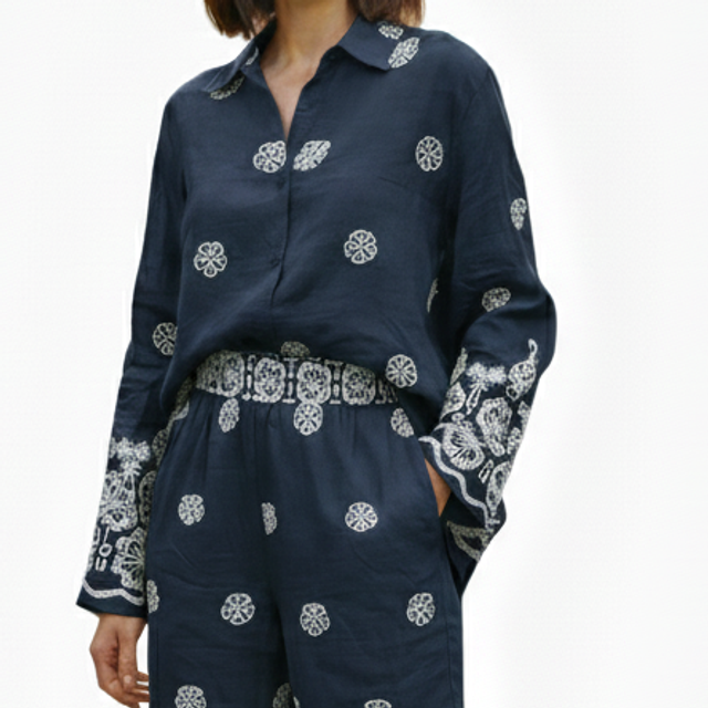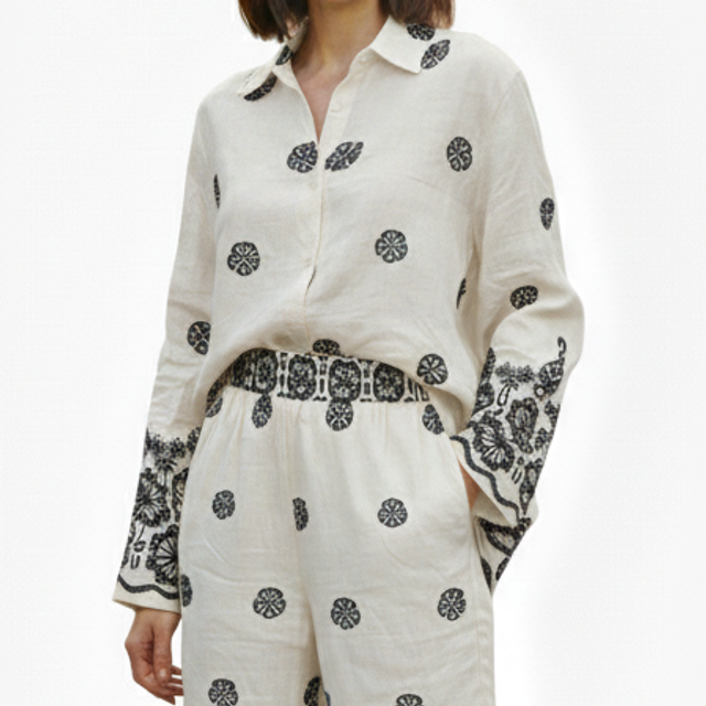 • Motifs exclusifs : Des détails d'imprimés délicats sur l'ensemble, soulignés par une large bordure ornementale au bas du pantalon et des manches.