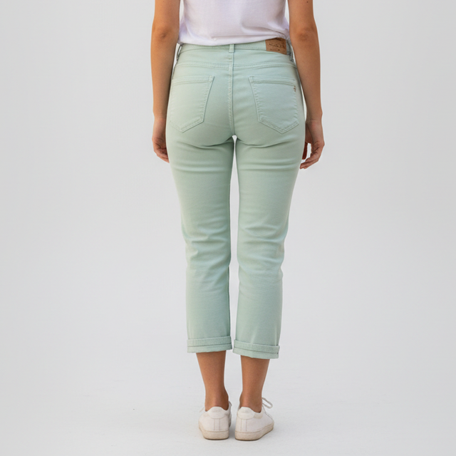 Boostez votre style estival avec ce pantacourt vert d’eau ultra-frais. Sa coupe 7/8ème moderne et sa teinte pastel lumineuse en font un indispensable du dressing printemps-été.