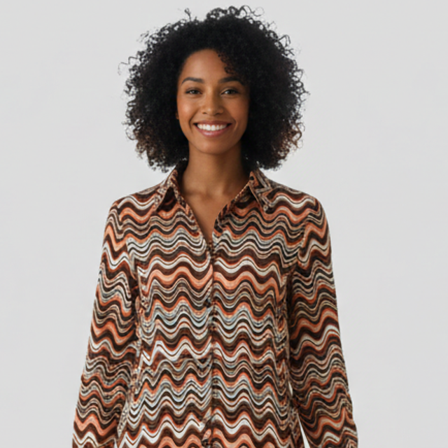Adoptez un look bohème chic avec cette robe chemise longue au motif ondulé rétro. Alliant confort et élégance, elle se distingue par ses tons chauds (marron, camel, crème) parfaits pour toutes les saisons.