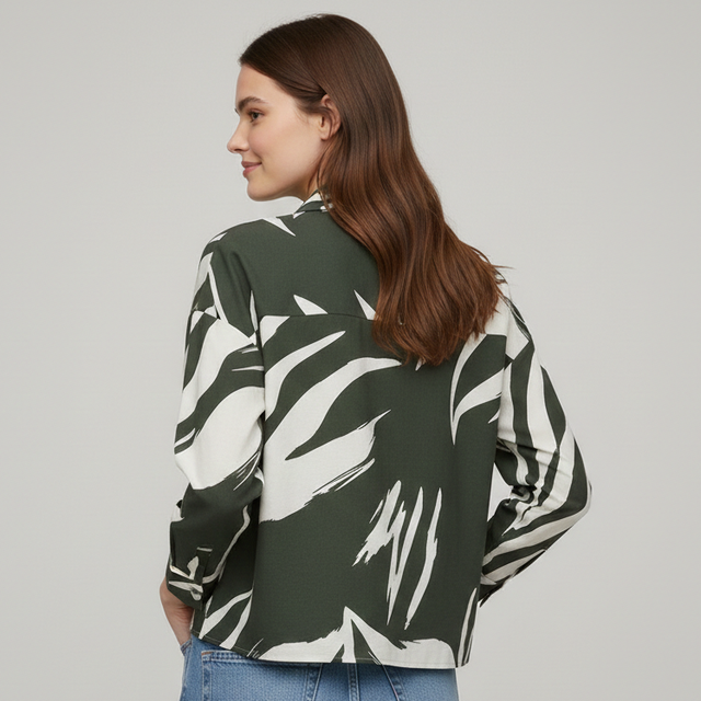 Chemise Courte Femme Imprimé Feuillage Vert et Blanc - Coupe Boxy