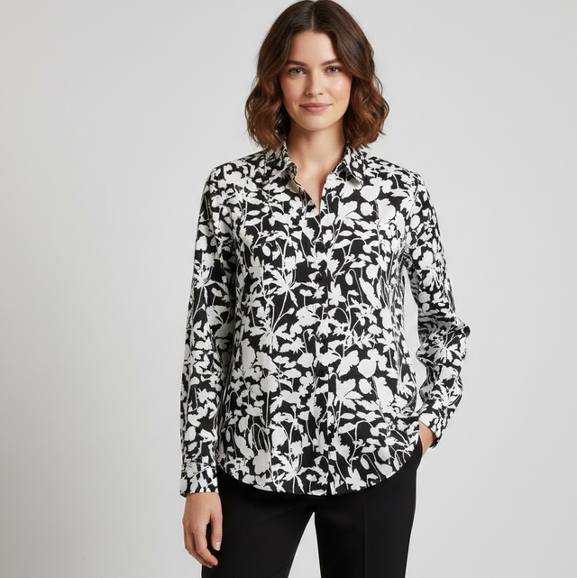 Affirmez votre style avec cette chemise Emma Ella au contraste monochrome irrésistible. Pièce maîtresse de la nouvelle collection, ce chemisier pour femme se distingue par son imprimé floral graphique, mêlant élégance intemporelle et modernité.